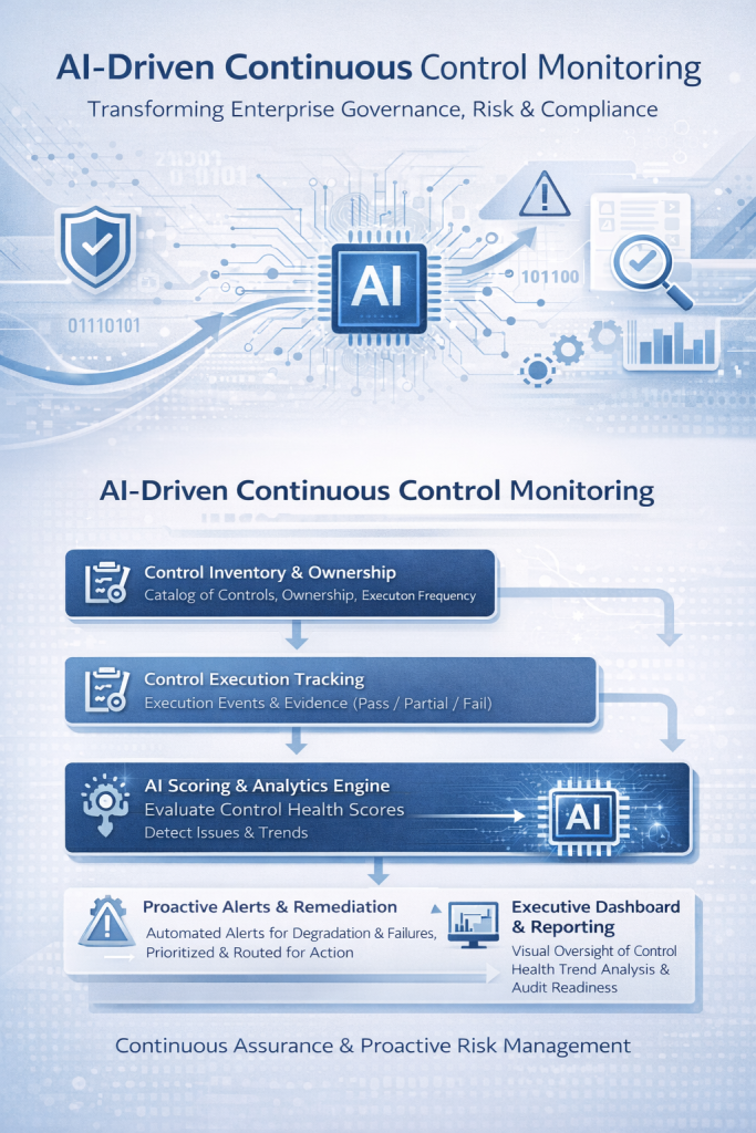 Traditional governance, risk, and compliance (GRC) frameworks depend heavily on periodic audits and manual evidence reviews — creating gaps in real-time visibility. AI‑Driven Continuous Control Monitoring (CCM) enables organizations to continuously evaluate control effectiveness, detect degradation earlier, and provide proactive risk alerts. This article introduces a vendor‑neutral CCM model powered by AI scoring, continuous evidence ingestion, and governance dashboards.